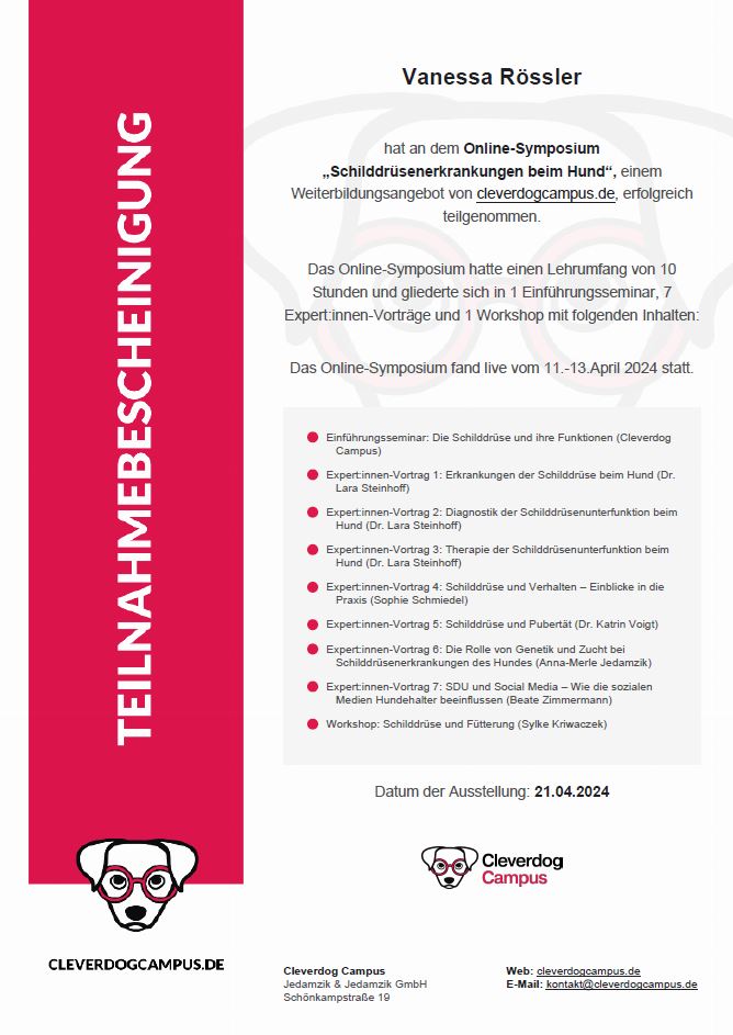 Endokrine ErkrankungenErkrankungen der SchilddrüseSchilddrüse des Hundes_Teil 1 AnatomieSchilddrüse des Hundes_Teil 2 DiagnostikSchilddrüse des Hundes_Teil 3 ErnährungSchilddrüse des Hundes_Teil 4 VerhaltenDiabetes beim HundEndokrinologische Erkrankungen beim Hund